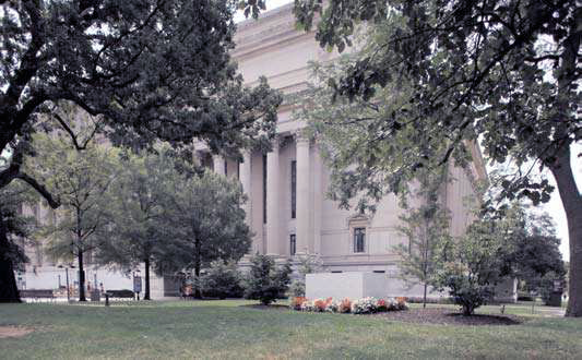 This original NA building is located near the east tail of the Federal Triangle between 7th and 9th Streets, with entrances via both Constitution and Pennsylvania Avenues. Congress provided initial funding in 1926, construction began in 1931, President Herbert Hoover laid the cornerstone in 1933 — and was completed, dedicated by President Roosevelt, and occupied in 1935. Symbolically, it lies halfway between the Capitol and the White House.